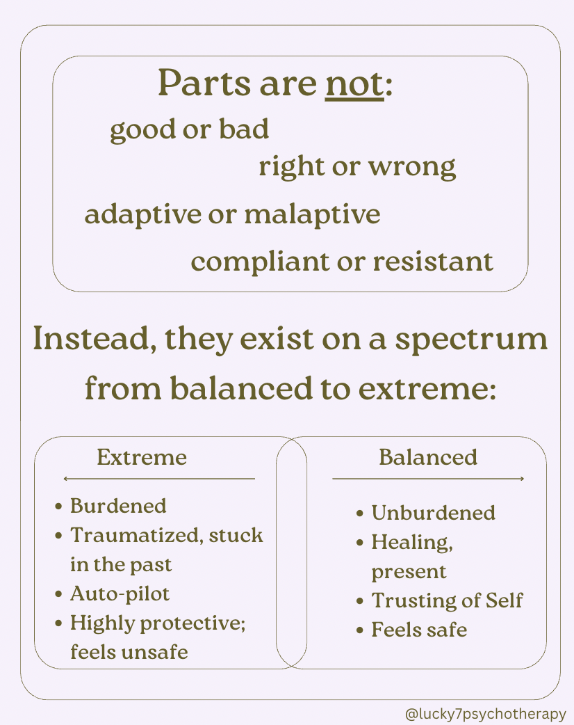 Parts are subpersonalities within us with unique roles and perspectives. They are: